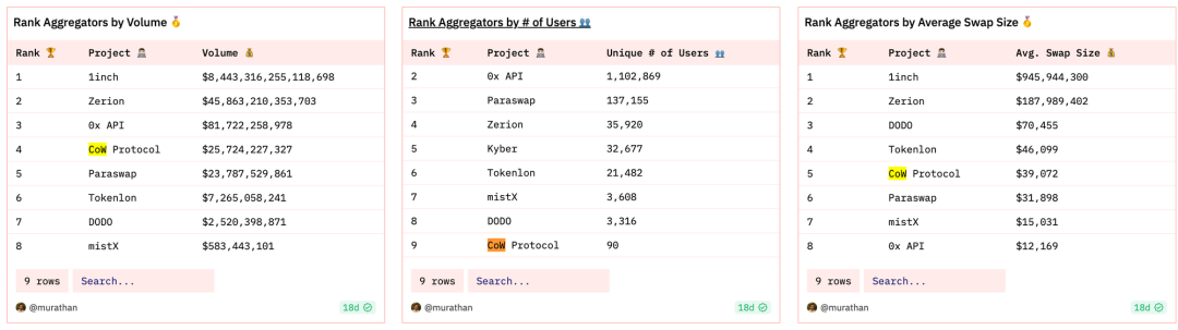 聚合器赛道横向对比。CoWSwap 交易量排名第四,用户数量排名第九,平均交易规模排名第五。其中,1inch 均位榜首。