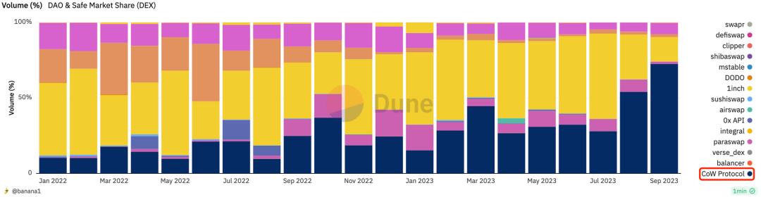 1/3 的 DAO 的交易量都在 CoWSwap 上发生。因为 DAO 时常需要大额的,抗 MEV 的交易,能满足 DAO 的特殊订单需求的平台,如限价单和 TWAP、Milkman ( 7 月 10 号,Milkman 被 AAVEDAO 使用,用于监控将 326.88 wETH 和 $1,397,184 的 $BAL 换作 B-80BAL-20WETH 的滑点)。该比例仍在增长,8 月份,CoWSwap 甚至占到了一半以上(54%)。