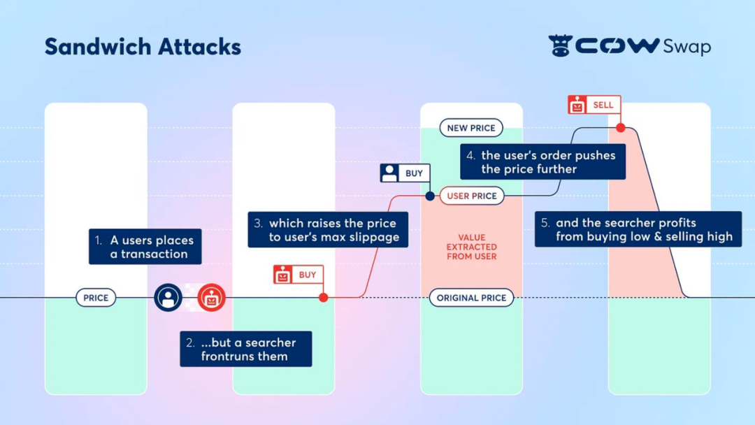 DeFi 用户一直是 MEV 攻击的受害者,比如抢跑(front-running)、尾随(back-running)和三明治攻击(sandwich attack)。CoWSwap 协议提供了 MEV 保护,力求减少用户的 MEV 损失。展开之前,让我们简单了解一下 MEV 攻击是什么。