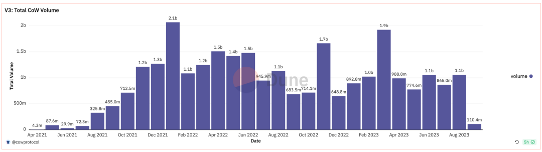 CoWSwap 每月交易量表现波动较大,截止 9 月 1 日,总交易量达到 $27.4B。