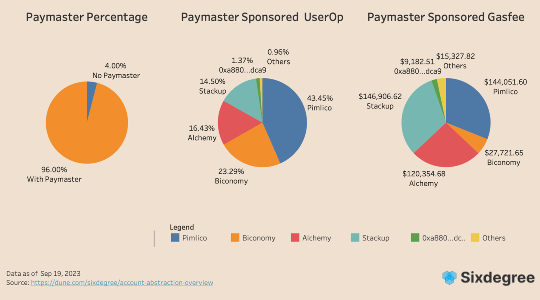 Paymaster 作为 ERC4337 标准中的可选项,实际上 96% 的 UserOp 的 gas 都是由 Paymaster 代为支付的,说明绝大部分的用户使用的 dApp 都开启了这一功能,为用户创造了 gasless 的体验。
