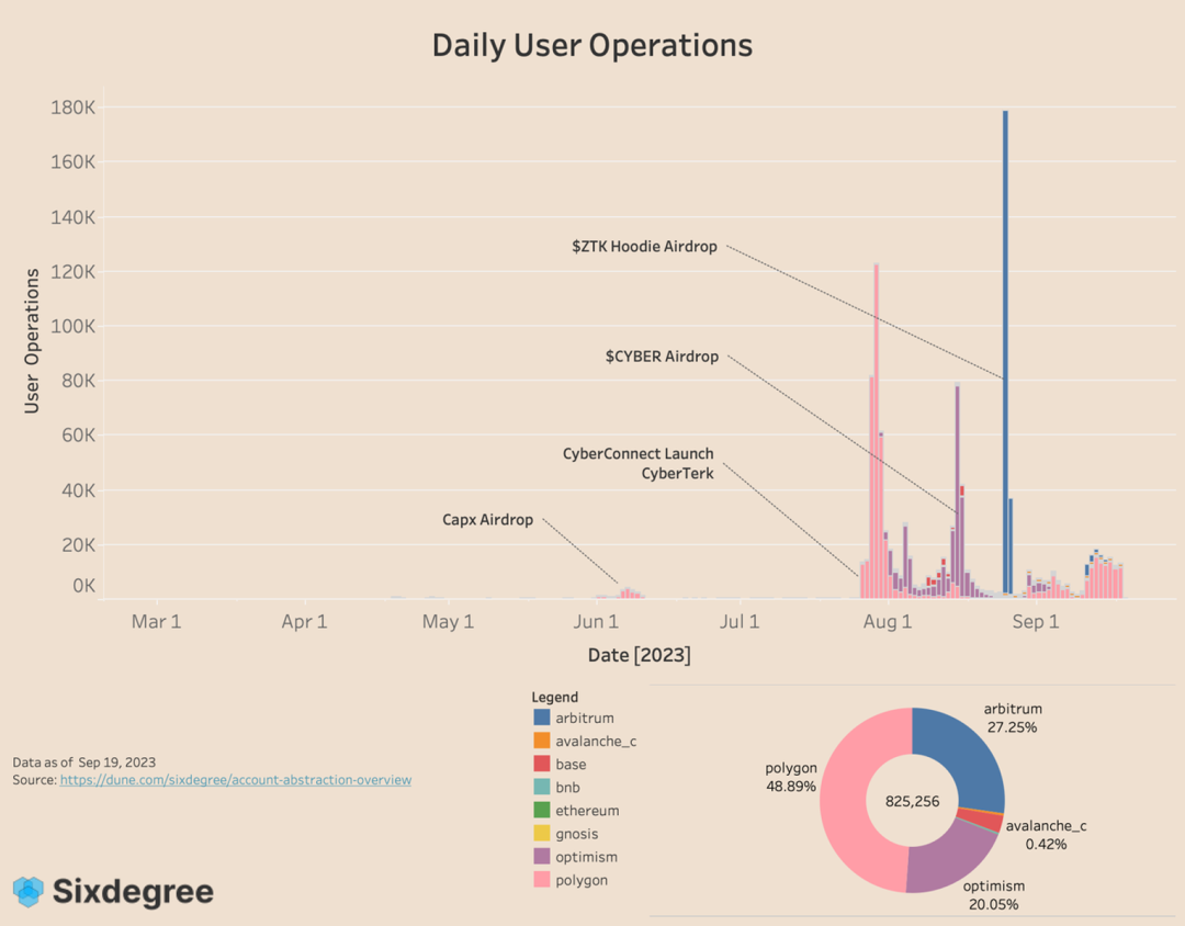 UserOp 的增长基本遵循着用户增长的曲线,唯一不同的是 UserOp 的增长有四次,因为 CyberConnect 的空投在 Optimism 主网上发放,需要用户用 AA 钱包领取。