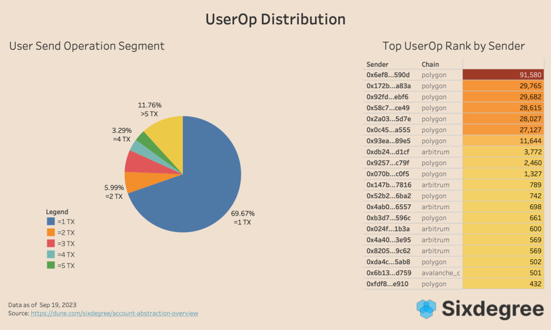 具体到每个 AA 钱包的活跃度来看,88.24% 的钱包使用次数小于等于五次,结合上面用户增长和 UserOp 增长图来看,大部分 AA 钱包用户都是由项目带来的一波流用户,意味着除了在项目指定的操作外,并没有太多额外的应用。