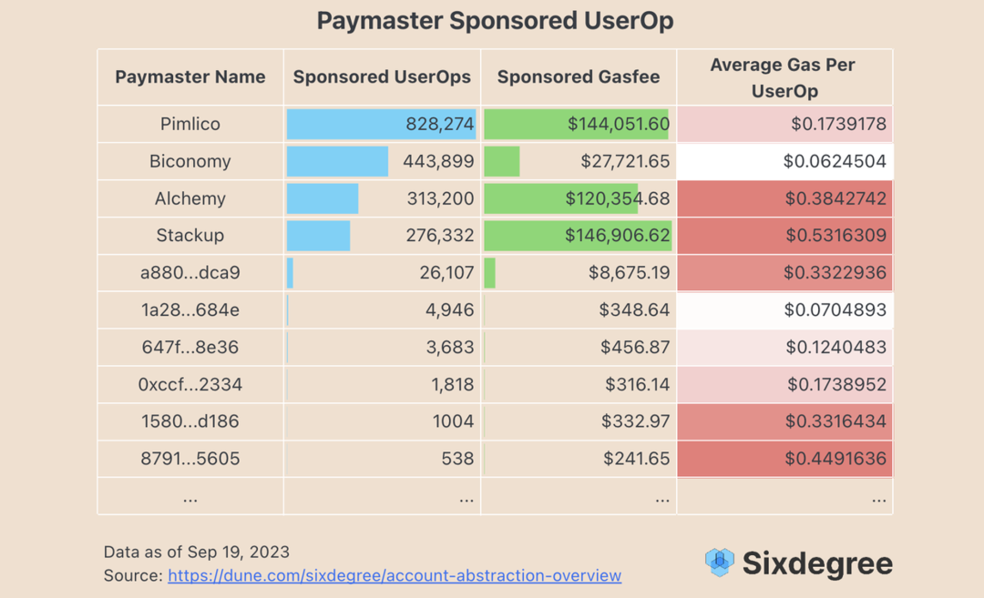 其中 Pimlico 代付的 UserOp 最多,占了总量的 43.45%,共代付 14.4 万美元。
