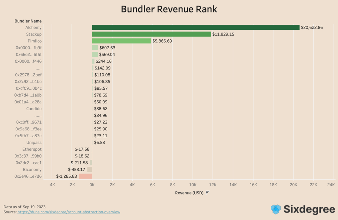 目前所有 bundler 共产生约$38k 的利润,88.38% 都处于不赚不赔的状态,其中 Alchemy 以$20k 的利润位居榜首,Stackup 和 Pimlico 以$11k 和$5.8k 位居二三。