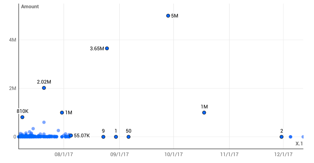 币安天使钱包2(2007万枚)。我们将这个钱包称之为天使钱包2,在2017年7月中旬币安交易所启动后的头两天内,该钱包通过三次转账(2000万+ 69,420 + 20)从部署者那里收到了20,069,440个代币。虽然这个钱包收到的代币略多于发送给天使钱包1的2000万整数,但我们猜测这些代币也是分配给天使投资人的,因为下一个图表中详细介绍了类似的数字和后续分配模式。对于加密货币侦探来说,值得注意的是,在天使钱包2和代币接收者之间存在一个中介钱包,但为了让表述尽可能简单,我们仍将称之为天使钱包2。在转入天使钱包2的2007万枚BNB代币中,币安在2017年7月向531个钱包分发了1740万BNB。2017年8月至12月期间,该交易所向79个钱包又分发了266万枚BNB。