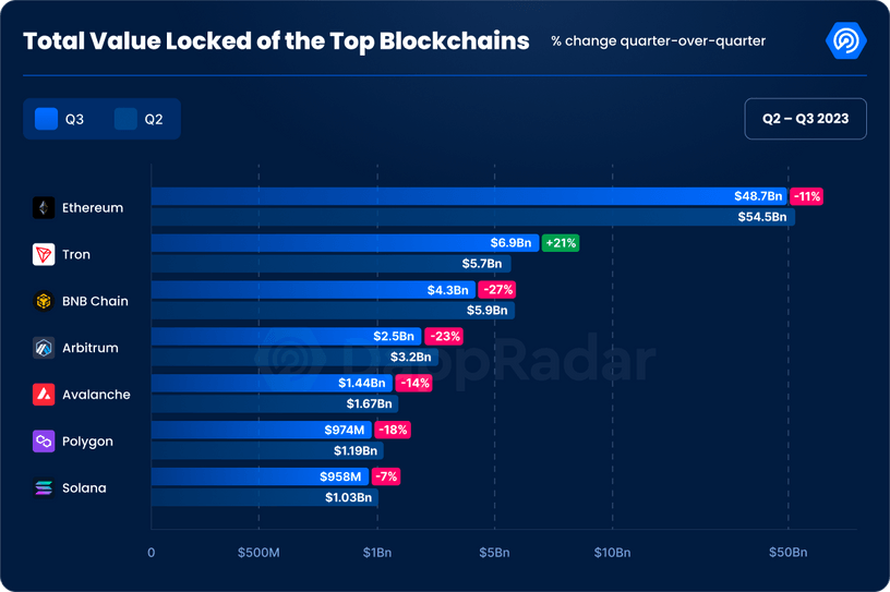在评估主要公链的 TVL 时,以太坊在 DeFi 领域的主导地位表现尤为突出,尽管较第二季度下降了 11 %。浏览我们跟踪的区块链项目可以发现公链的 TVL 整体呈下降趋势,但 Tron 却逆势而上,较上季度增长 21 %。
