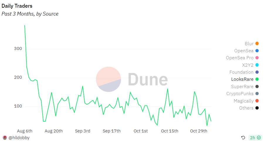 从结果来看,LooksRare 交易挖矿的结束使得该平台虚假交易量(如下左图)骤降接近零,对真实交易量(如下右图)的影响则相对有限。另一方面,从交易者数量变化来看,LooksRare 交易者在 8 月初便有较大的下滑,而待交易挖矿结束后,交易者数量却仍在同一个区间内波动,这似乎在说明,在 8 月至 9 月末这段交易挖矿即将结束的后期阶段,所进行交易挖矿的用户仍在交易挖苦结束后(10 月)留存。这样的变化可能反应在 LooksRare 存在一批忠实用户,或存在团队下场交易的可能。