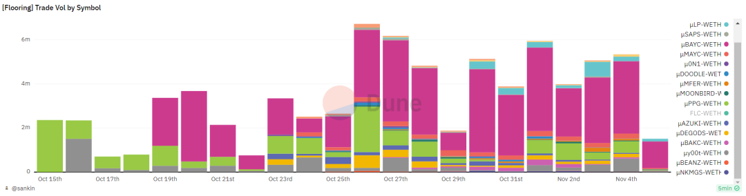 也正是因为个人做市商的存在,Blur 在面对新的后来着 Flooring Protocol 的挑战时显得十分从容。Flooring Protocol 是将 NFT 碎片化成为 ERC-20 μToken 的流动性解决方案,由 NFT OG 玩家 FreeLunchCapital 所推出。配合着 FLC 的激励,Flooring 的日均交易量约在 400 万至 600 万美元间(不含 FLC,仅包括 NFT 碎片化后的 μToken)。