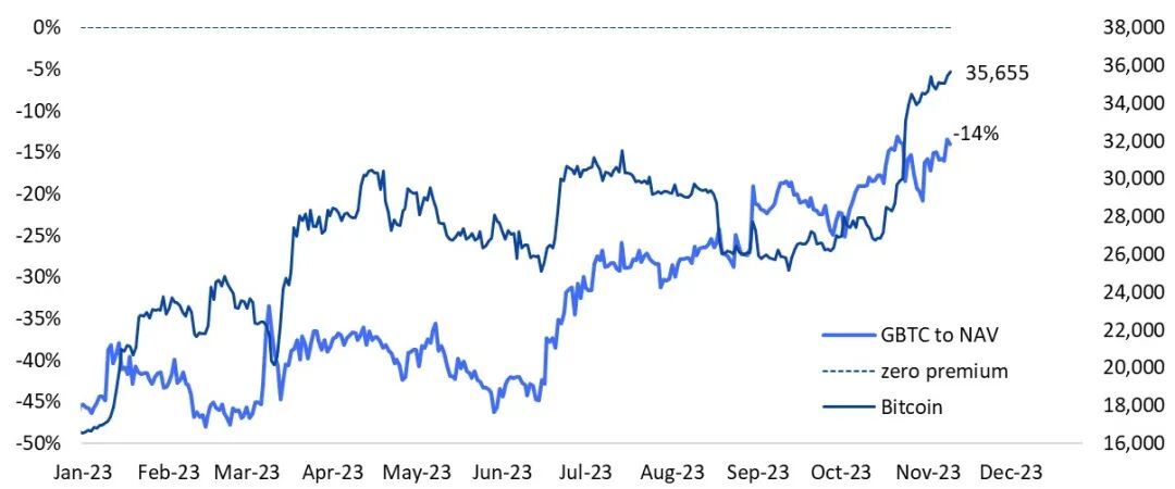 图表 3: 灰度 GBTC 相对资产净值的折扣已从 -45% 收窄至 -14%,表现优于比特币