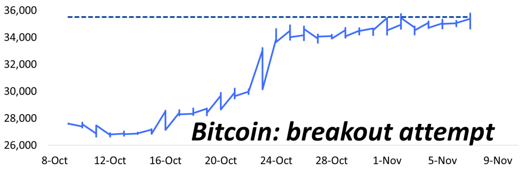如果通胀再次下降,下周美国的 CPI 数据可能会引发比特币的又一轮上涨。我们预计比特币 将试图突破最近 3.4 万至 3.5 万美元的交易区间。突破 36,000 美元可能会推动比特币走向下一个技术阻力位 40,000 美元,到 2023 年底可能达到 45,000 美元。随着美国交易时间内买家的稳步增加,以及比特币突破的持续尝试,我们可以看到价格在本月底(和年底)反弹。圣诞老人行情随时可能开始。
