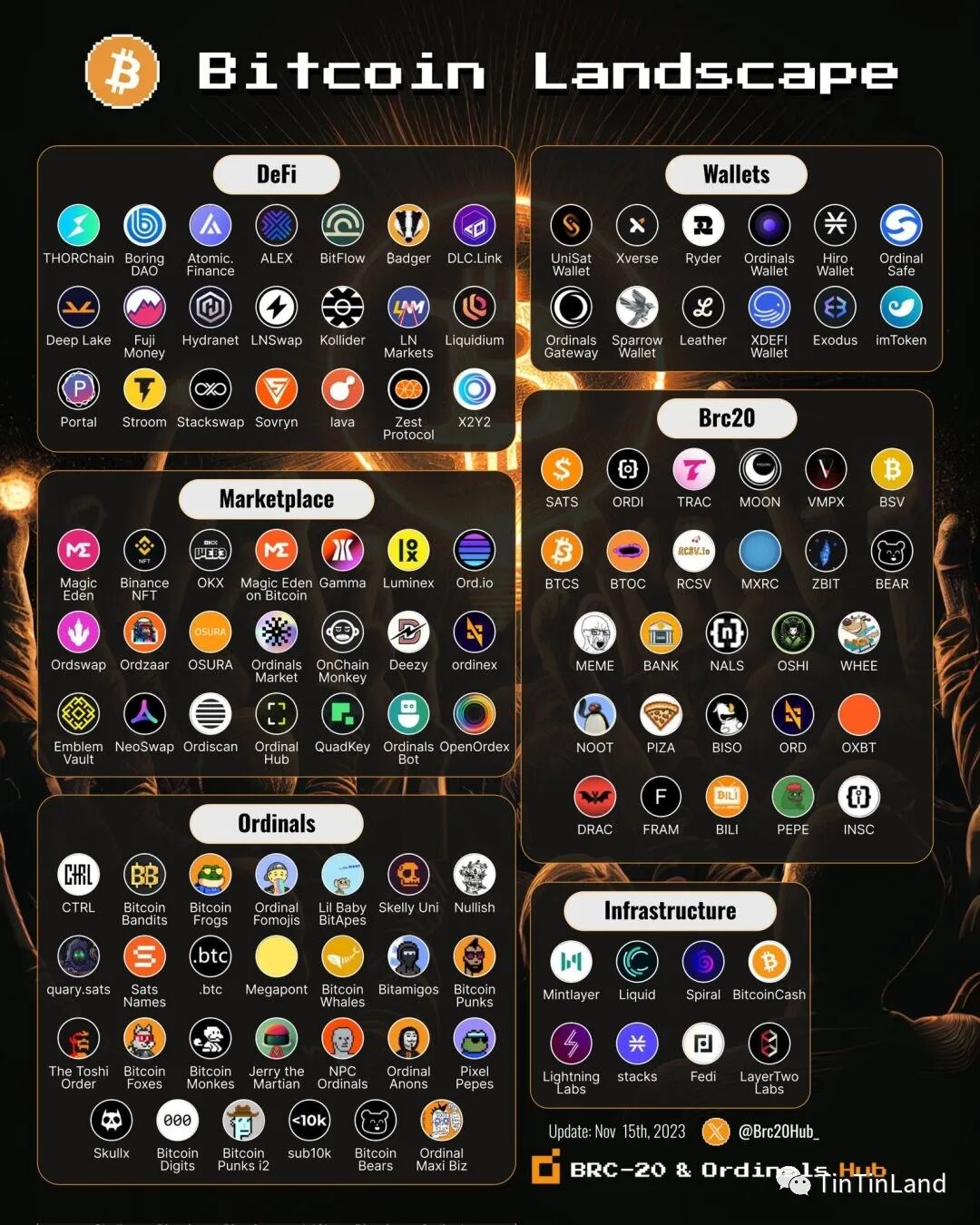 同时,BTC 生态系统正在迅速扩张。来自 DeFi、Wallets、Marketplace、BRC20、Ordinals、Infrastructure 等领域不断涌现新项目,加速拓展着 BTC 的生态版图。