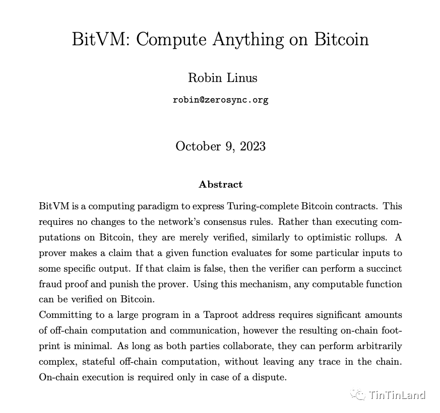 10 月,ZeroSync 项目负责人 Robin Linus 发布了《BitVM:在比特币上计算任何内容》白皮书,其中他指出 BitVM 能够实现图灵完备的比特币合约,而无需改变比特币的共识规则。它可以执行几乎任何任意计算,并利用该计算来执行链上比特币交易,进行离线计算,而不会在链上留下任何痕迹。