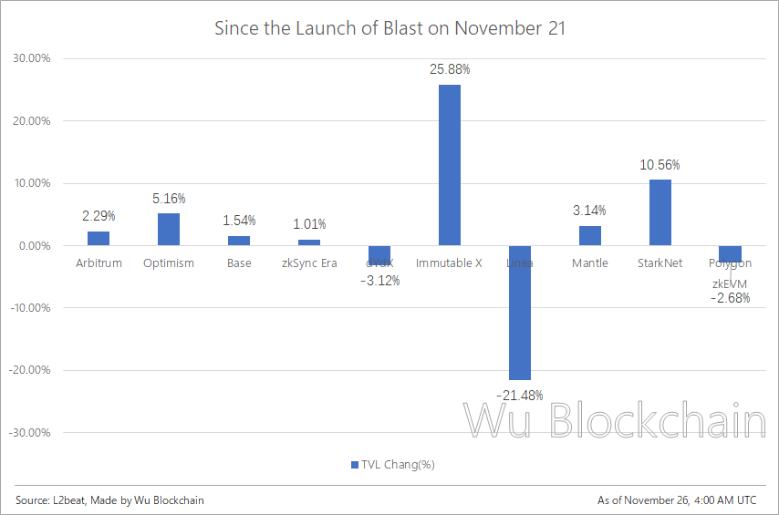 去掉极值后,图表更为清晰。包括 Arbitrum 和 Optimism 已经发币的成熟头部 L2 和备受期待的 Base、zkSync Era、Mantle 和 StarkNet 的 TVL 均是正增长。Blast 的出现对其他 L2 的影响可能比市场声音所认为的要小得多。