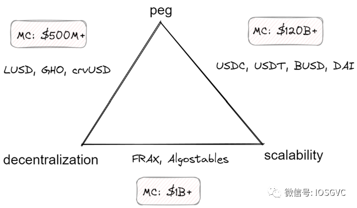 加密原生稳定币试图控制上述风险,然而,每种设计最终都会遇到稳定币三难问题,需要在以下三者中选择两项: