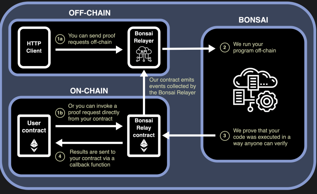Bonsai: 在2023年,RISC Zero发布了Bonsai,这是一个证明服务,允许链上和链下应用请求并接收zkVM证明。Bonsai是一个通用的零知识证明服务,允许任何链、任何协议和任何应用利用ZK证明。它具有高度并行性,可编程性和高性能。