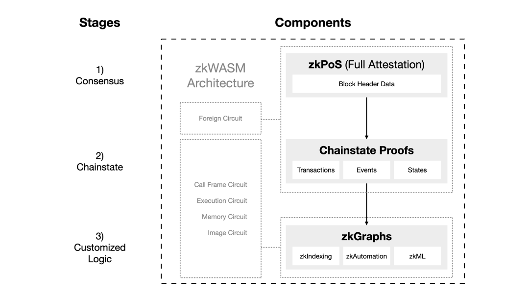 - zkPoS:这个组件负责通过零知识(zk)证明获取以太坊区块链的区块头和数据根,以确保以太坊共识的正确性。zkPoS还充当zkWASM的外部电路。