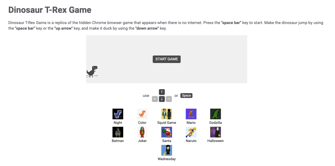 Chrome Dino Game 的在线版本,网址:https://dinorunner.com/