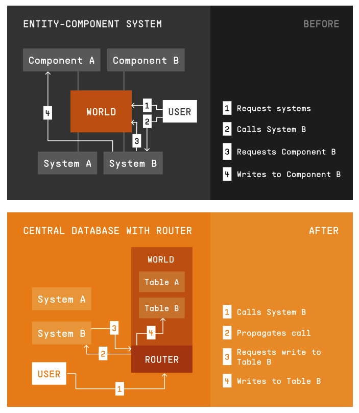 那么我们看看,MUD 引擎的设计是否也遵循了“数据库本位”的思想。从 MUD 引擎的设计思路看,它核心解决三个问题: