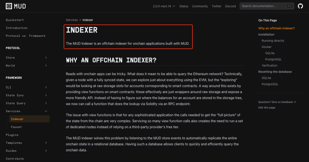 这主要是通过 MUD 引擎中的 Indexer 实现的。下图为 MUD 官方对 Indexer 的介绍,主要面向想在搭建运行在项目方服务器上的场景(当然该描述也同样适用于,自动运行在全链游戏客户端内的 Indexer)。