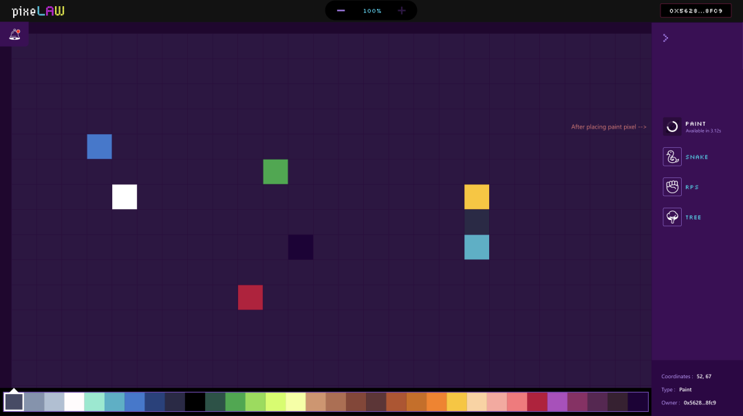 个人认为,元规则(Meta Rules)类相对更有潜力,因为至少能在规则层面、互操作性层面有更多原生的可能性,不过现在还很早期,尚难以评估其确定性,下图为元规则类全链游戏 PixeLAW 的界面。