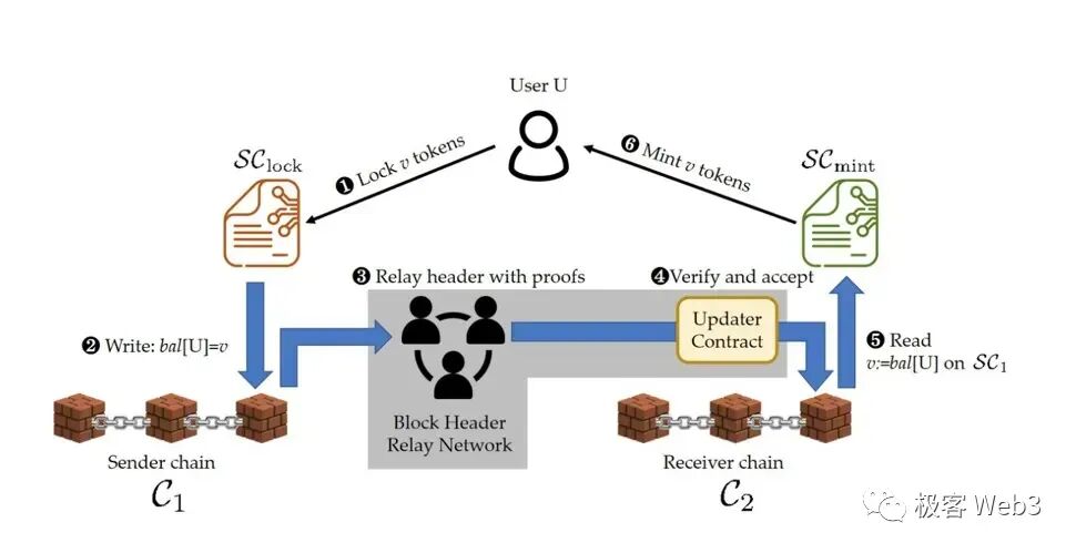 在很多基于轻客户端方案的跨链桥中,常常会用到上面讲到的,轻节点和Merkle Proof的轻量与简洁性。比如说,Map Protocol等ZK桥,会在ETH链上设置一个合约,专门接收其他链的区块头(比如Polygon)。当Relayer向ETH链上的合约,提交Polygon第100个区块的header后,合约会验证header的有效性(比如是否凑足了Polygon网络内2/3 POS节点的签名)。