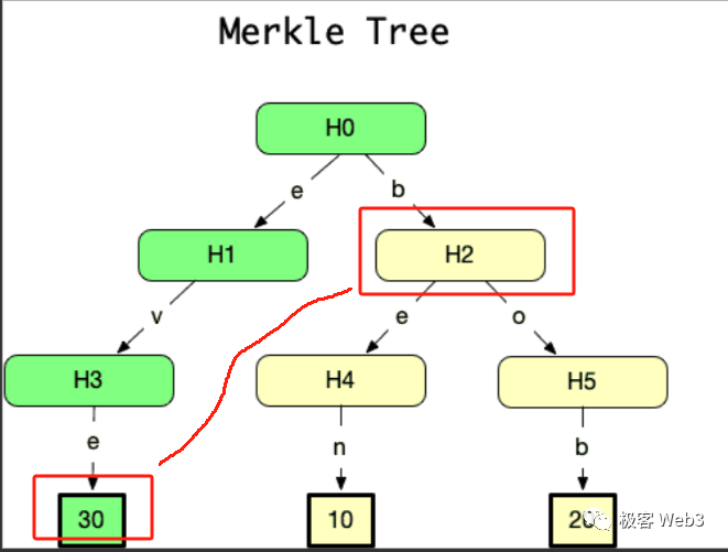 (图中的数据块30和H2就可以构成Merkle Proof,证明数据块30存在于H0对应的Merkle Tree上)