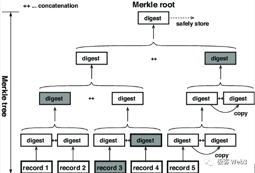 以上图为例,假如李刚只知道图中Merkle Root的数值,不知道完整的Merkle Tree包含哪些数据。我们要向李刚证明,Record 3的确和图中的Root有关联性,或者说,证明Record 3的哈希存在于Root对应的那棵Merkle Tree上。