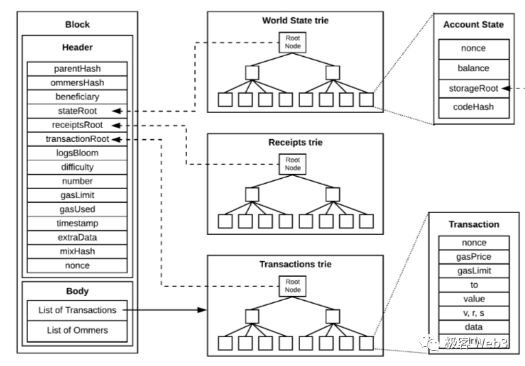 另一个区别在于,State Trie整体的数据量特别大,它的底层叶子对应着以太坊链上所有地址(实际上还有很多过时的状态哈希),所以State Trie对应的原始数据集不会发布到区块中,只在区块头记录下StateRoot。而交易树的原始数据集就是每个区块内的Txn数据,这棵树的TxnRoot会记录在区块头里。