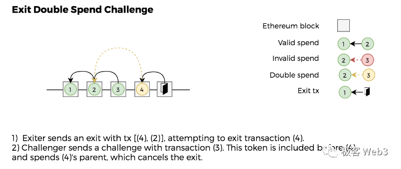 所以,A的行为实际上是:花掉10枚ETH后,声明自己在以前有10枚ETH,并尝试把这些ETH提走。这就是典型的“双重提款”,双花。此时,任何人都可以提交Merkle Proof,证明A用户最新的资产状况,不满足其提款声明,也就是证明A在100号区块后,没有提款声明的那些钱(不同的Plasma方案针对这种情况的证明方法不一致,账户地址模型远比UTXO的双花证明麻烦的多)。