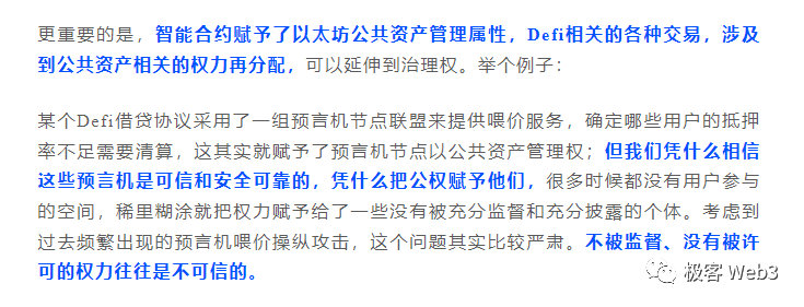 显然,该怎么处置这些由Defi合约所支配的“公共财产”,是一个巨大的雷。这其实涉及到公权力分配的难题,此前响马曾在访谈《高性能公链难出新事,智能合约涉及权力分配》中谈到过这点。