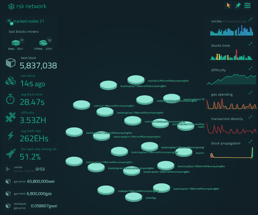 RSK采用融合挖矿(Merge-Mine)算法,比特币矿工可以几乎无成本地帮助RSK进行出块,获取额外奖励。RSK中没有原生的token,仍采用BTC(RBTC)作为Gas Token。RSK有自己的执行引擎,对EVM兼容。