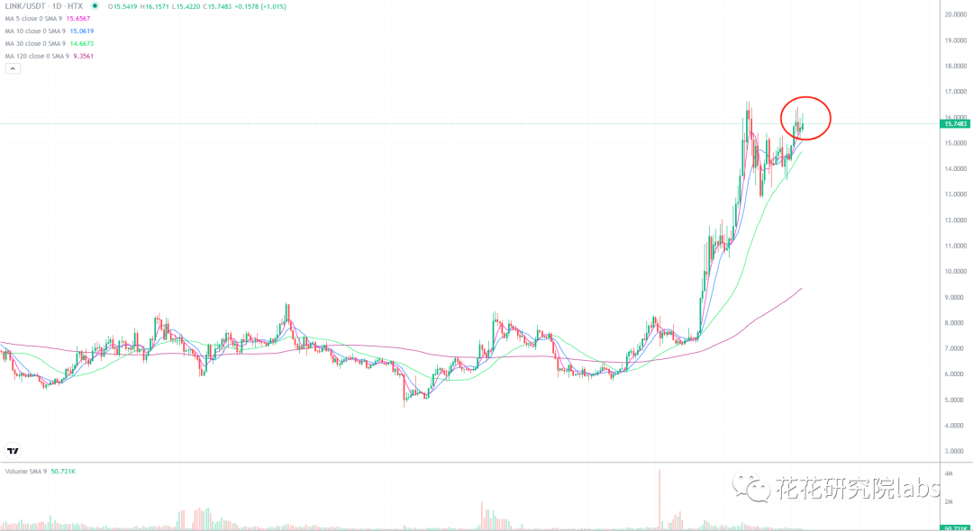 link短线上方开始插针,抛压开始出现,短线预计调整一下,不破14还有机会新高,一旦跌破14建议减仓。