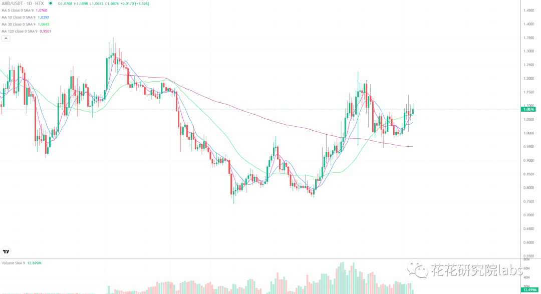 arb大涨前我们就已经布局了,日线走势不错,继续持币吧,预计还有空间,止损是0.94。