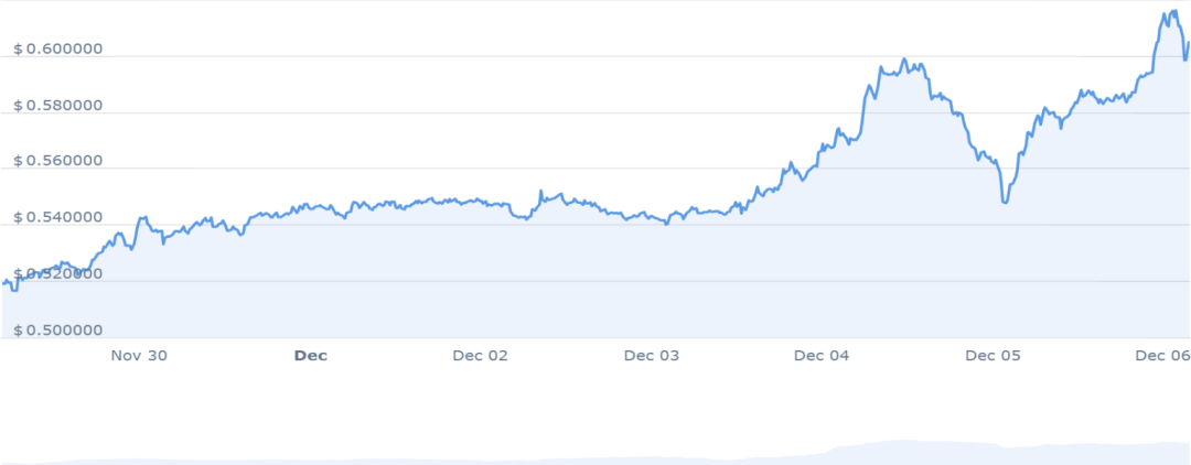 卡尔达诺的原生加密货币 ADA 最近经历了大幅上涨。这一激增使 ADA 的市值在短短 24 小时内增加了 10 亿美元。根据CoinMarketCap排名,目前其市值约为154.2亿美元。因此,它巩固了全球第八大加密货币的地位。