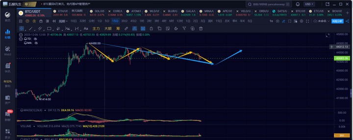 大饼目前正在运行一笔1h级别的回调,这笔回调预期不会太深,先关注43000~43300区域,跌破则看42500~43000。然后还会再走一笔1h级别的反弹,下一笔1h级别的反弹就要看力度了,可以创新高给出一卖。也可以不创新高给出二卖。耐心等待结构到位。