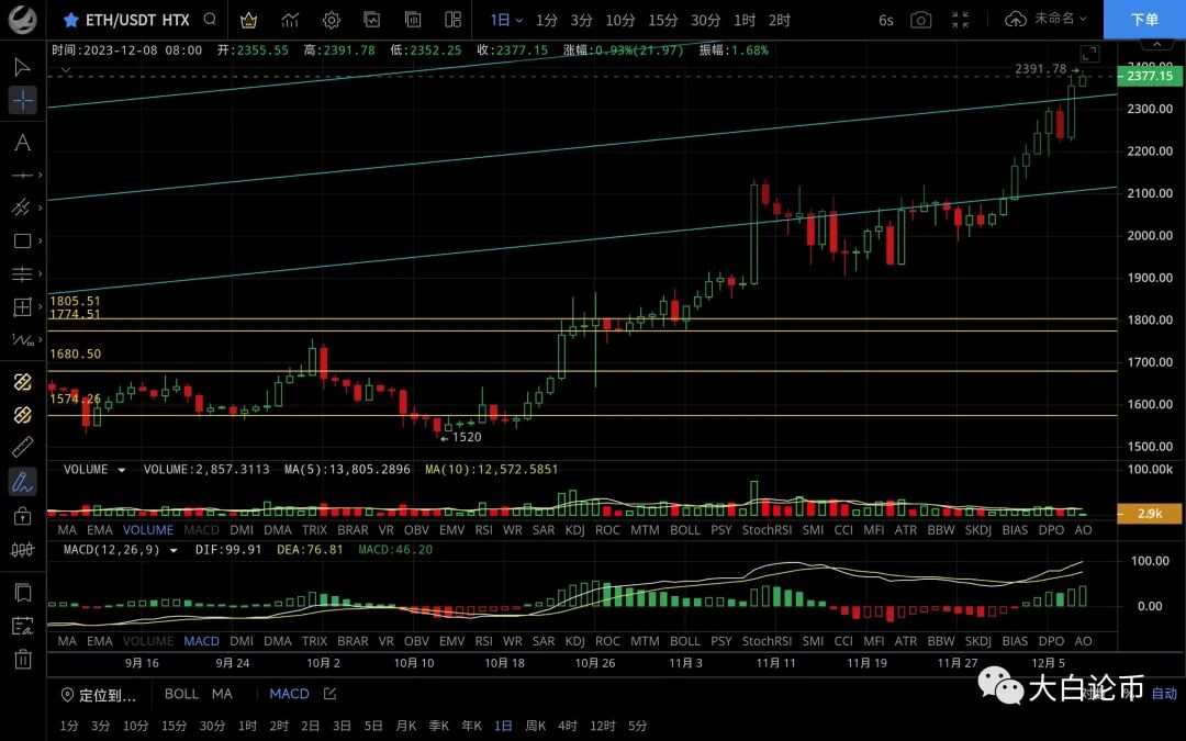 以太坊昨日低位回踩至2222一线未破前低,随后行情一路反弹上行,突破新高至2391一线受阻回落,恭喜跟上昨日思路的朋友多单获利100点,目前币价在2370附近运行,四小时级别k线拉升后呈连阳碎步上行,目前处于压力区域受阻,短期有回落需求,ma7均线上扬,macd多头运行双线金叉向上,整体来看多头较为强势,日线级别k线九连阳,以太坊属于超涨,其他币种没动,目前行情切勿追涨,随时有下杀的可能,整体依然是多头趋势,思路建议回踩后逢低做多为主高空为辅,上方压制2400-2460,下方支撑2350-2320