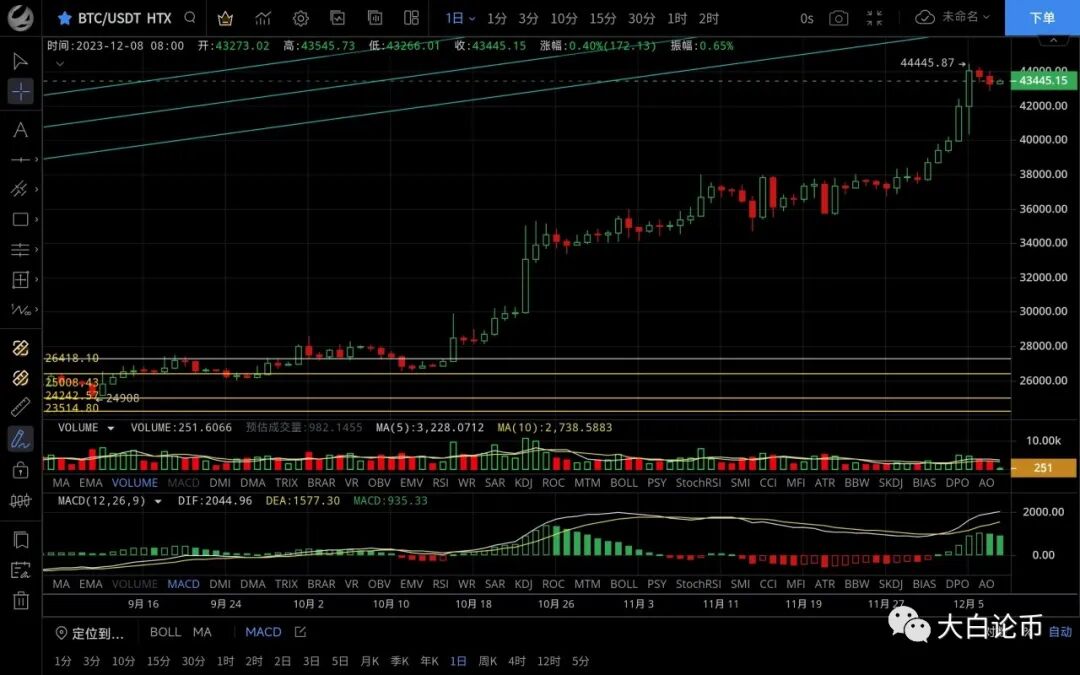 大饼昨日整体走弱,走势如文中思路一致,呈回踩走势,低位跌至42868一线支撑反弹,高位触及43882一线受阻,恭喜跟上昨日思路的朋友多单获利800点,目前币价在43460附近运行,四小时级别k线跌破ma14,ma7拐头向下形成死叉,macd空头运行双线死叉状态,虽偏向空头但回踩力度不大,短期虽有反弹但上方受ma14压制,预计突破站稳的概率不大,估计还有回调需求,日线级别从走势来看行情需要回踩来修复均线,预计力度不会太大,目前顶部还没出现,但空间不多了属于鱼尾阶段多单需要注意,日内将持续震荡走势,思路建议高空低多对待,上方压制44000-44500,下方支撑42800-42200