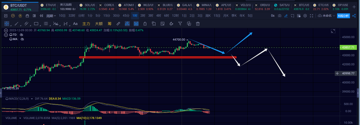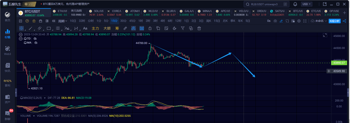大饼在前天开始的一笔1h级别的反弹已经顺利的走出来了,最终破了下前高,最高已经来到了44700附近,产生了背驰后,短线是要走一笔1h级别下的,可以先关注1h回调力度,如果无法跌破42821,那就会盘整一个1h的中枢再向上延伸。跌破看4h级别的一笔下。