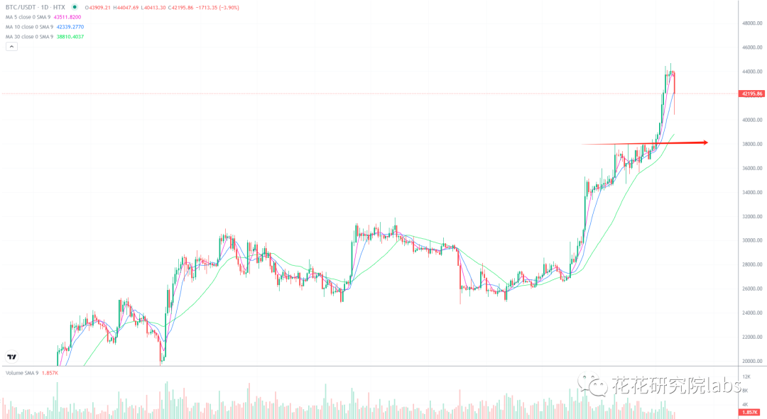 周末行情和我们预期一样,就是震荡, 但是山寨币表现一般,没有特别炸裂的出现。回到今天的盘面,比特币今天迎来断头铡回调了七八个点,山寨币直接雪崩,花哥在之前的文章也强调了,现在已经是接近尾巴的位置,该落袋的一定要落袋。经过这么一跌,短线想要上涨就比较困难了,花哥预计这周可能要震荡或者回调调整了,不要着急操作,等行情企稳之后再去下手。花哥预计38000是一个不错的补仓位置。