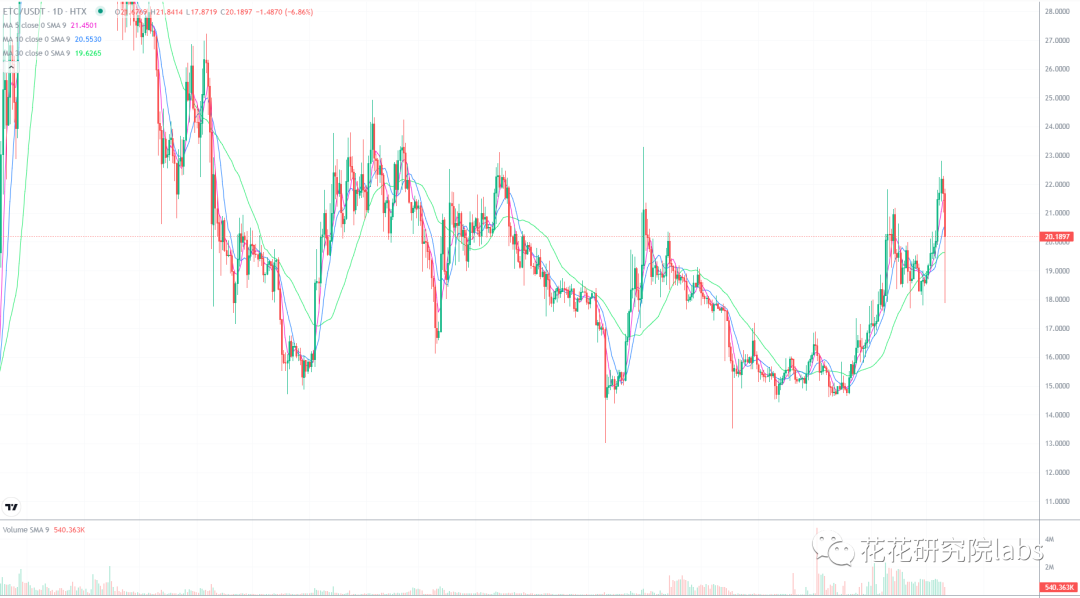 etc跌破5日均线就不能持有,上篇文章有讲,今天插针也插到位了,预计这两天要震荡修复一下了。