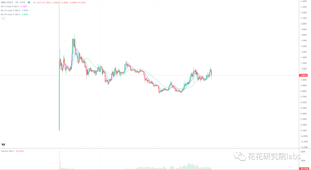 arb没有达到预期的涨幅,但目前跟上的应该也是盈利的,建议设置两个止损点位,跌破1美金止损一半,跌破0.94短线全部走势。
