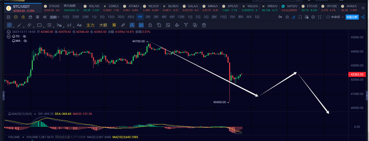 我个人实际有在44100,44300附近有建了三笔的空单,这两天比较忙,没有过多的关注。社群只提示了行情有下跌的趋势,没有直接喊空单。因为前几天震荡也不好确定是不是走一笔4h下。