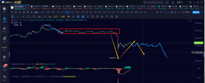 1h级别,当前正在运行4h级别下跌中的第一笔1h级别的下,这笔1h下应该没有走完,还会回踩下41000或41000~40500区间。40000附近应该是可以撑住第一笔1h的下,之后再走第二笔1h级别的反弹看42500附近,最后还有第三笔1h级别的下跌,届时关注40000附近支撑了,跌破看38800附近。