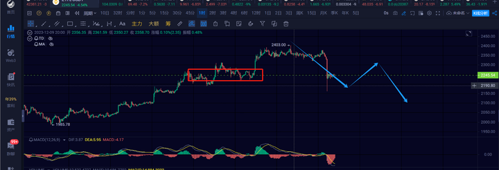 在最近的行情分析中,我们说需要关注42821,跌破至少要走一笔4h级别的回调。目前大饼已经顺利的跌破了,那么当前4h回调正在运行中,这笔回调没有结束。下方主要支撑在39800~40000,如果失守了,那需要看一笔日线级别的回调了。