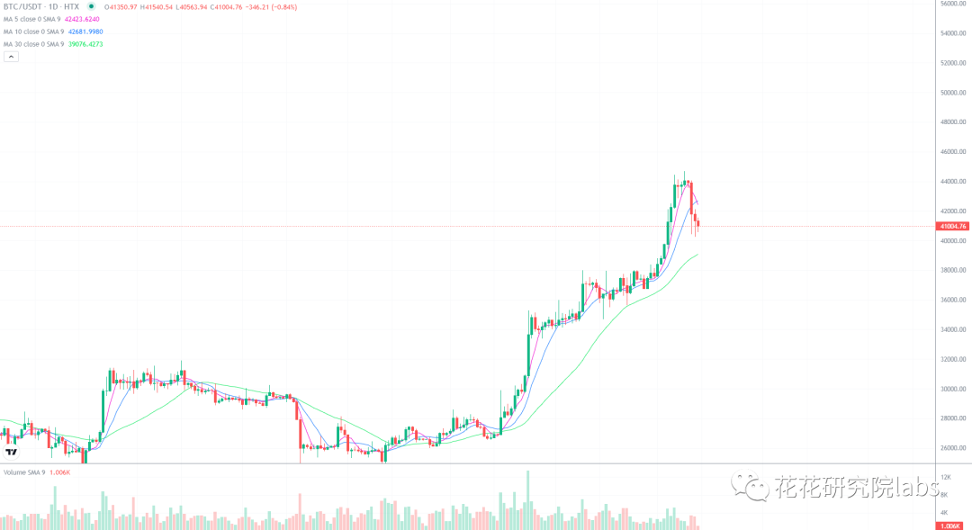 回到今天的盘面,比特币再次向下插针,但最近的插针都没有跌破40000,说明40000的支撑在短期还是很强的,花哥认为这里就两种走势,第一种是不破40000,上下插针震荡调整,第二种是跌破40000继续回调,花哥预计震荡的可能性会大一些,近期还是减少操作,观望为上,如果操作,就追着市场热点,强势币去操作!