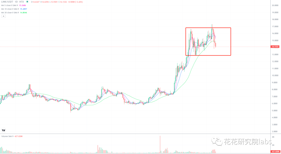 link现在就高位震荡区间内运行,剩余的仓位重点关注下方的支撑,一旦跌破支撑,则会日线级别的回调。