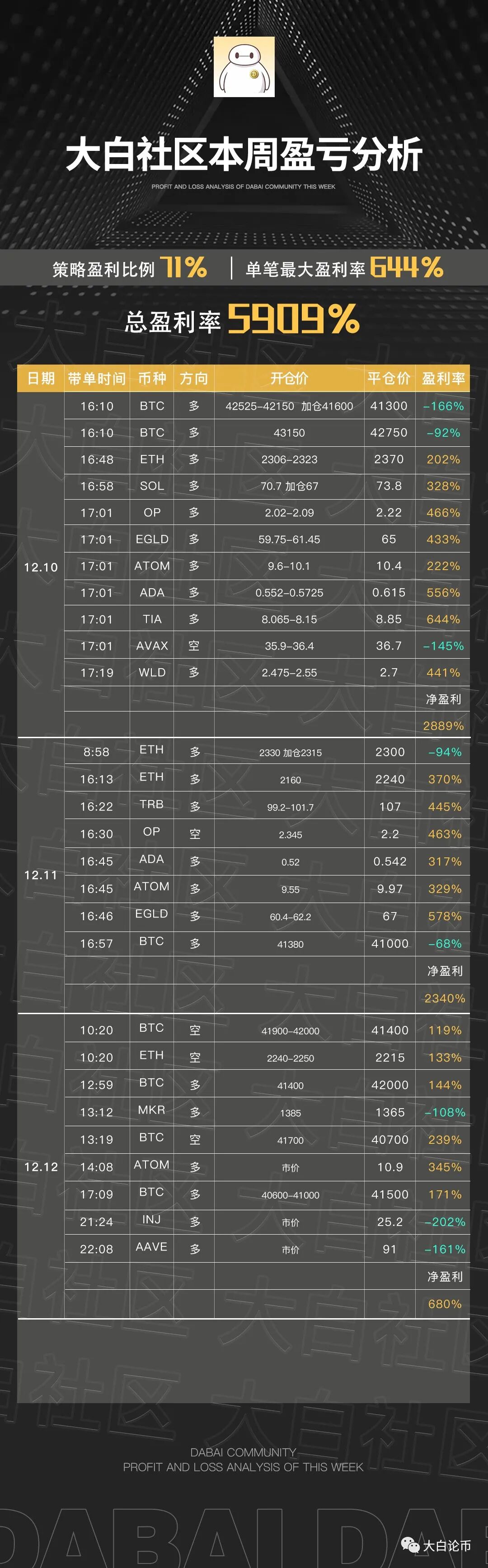 下方是大白社区本周实盘群单子,恭喜跟上的币友,如果你操作不顺,可以来试试水。