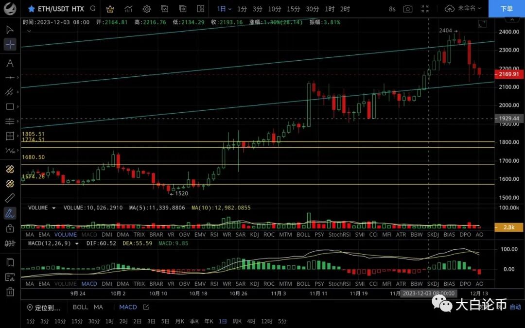 以太坊走势与大饼一致,昨日高位触及2244一线受阻回落,随后整体呈下行低位跌至2150一线支撑,恭喜跟上昨日思路的朋友,目前币价在2170附近运行,四小时级别行情呈震荡下行,跌至前低附近,若能收线在ma120上方则会继续震荡,若破位有机会去2100区域,行情反弹力度薄弱,短期指标信号偏向空头,日线级别k线连阴,macd高位死叉,走势来看还有回落需求,但方向没有改变依然是多头趋势,回踩到位后可以布局多单,日内思路建议高空低多对待破位持有,上方压制2200-2230,下方支撑2150-2100