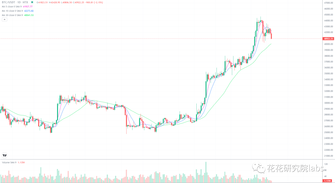 回到今天的盘面,比特币开始回调,短期又要开启40000的保卫战,花哥认为短线行情还是要关注40000的支撑,回调不破40000依旧还是高位震荡行情,回调跌破40000,那很有可能要去回踩35000-38000,甚至发生比较大的回调。如果跌破40000,注意找机会低买强势币。
